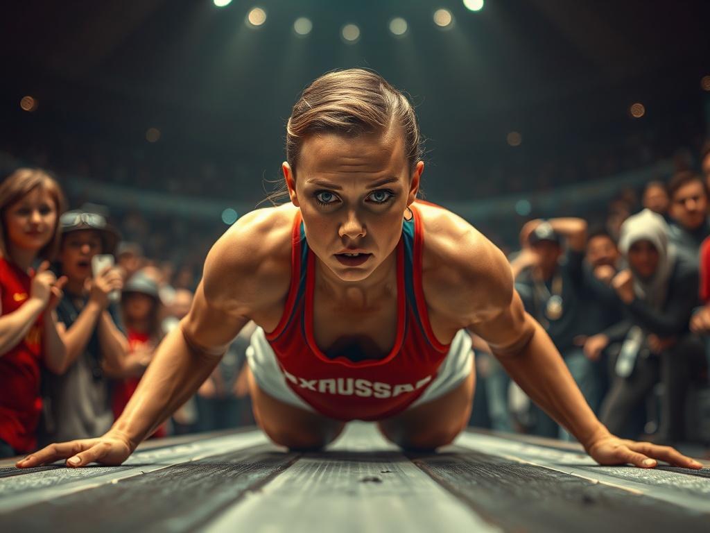Alt text: Ginasta russa com expressão séria durante queda dramática, público surpreso ao fundo. Hashtags: #meme #gymfail #dorésóumindset #kkk #vibes