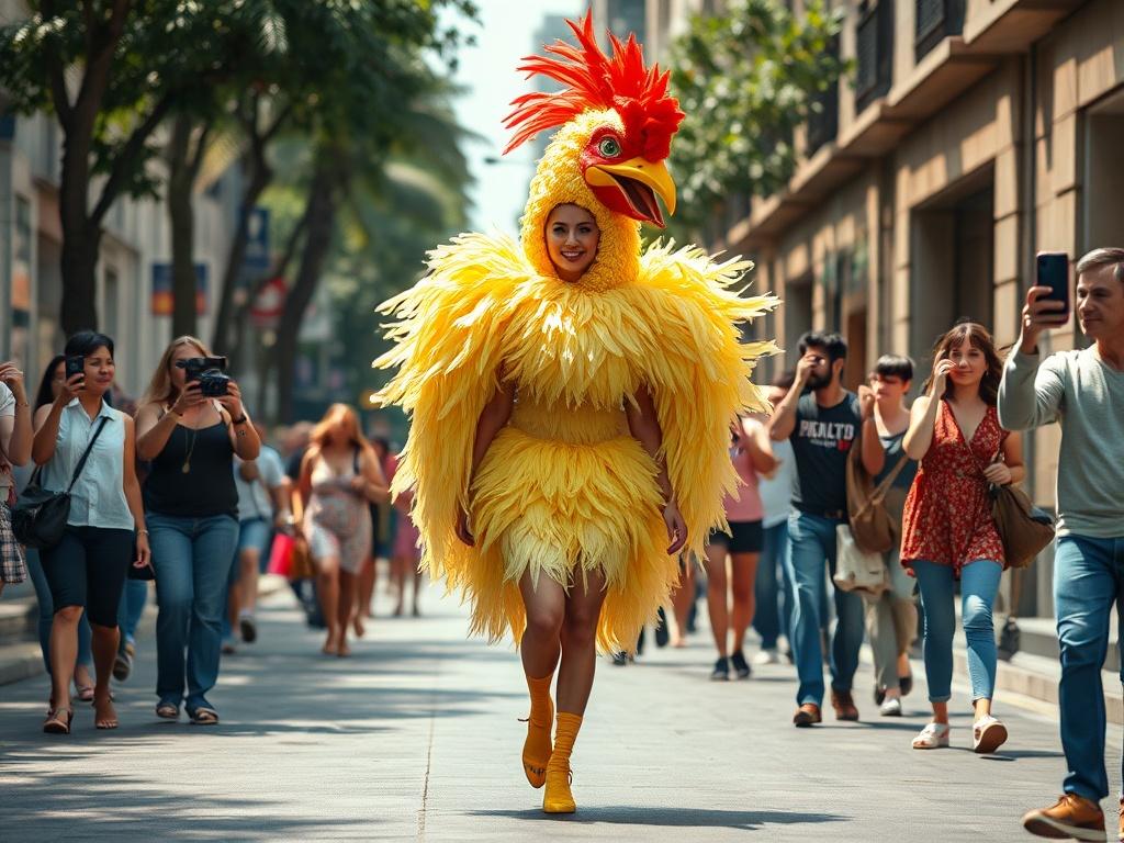 Era só uma aposta besta entre amigos. Resultado: eu, trajando uma fantasia de frango gigante, encarando a vida em plena praça. Spoiler: 0% vergonha, 100% cliques.