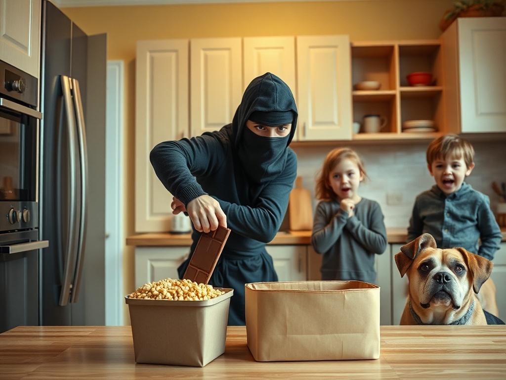 1) Dissimuler le butin dans un endroit improbable (ex : boîte de céréales vide). 2) Adopter l'attitude "je ne sais pas où est le chocolat". 3) Rire intérieurement quand ils fouillent la maison comme dans une enquête Netflix.