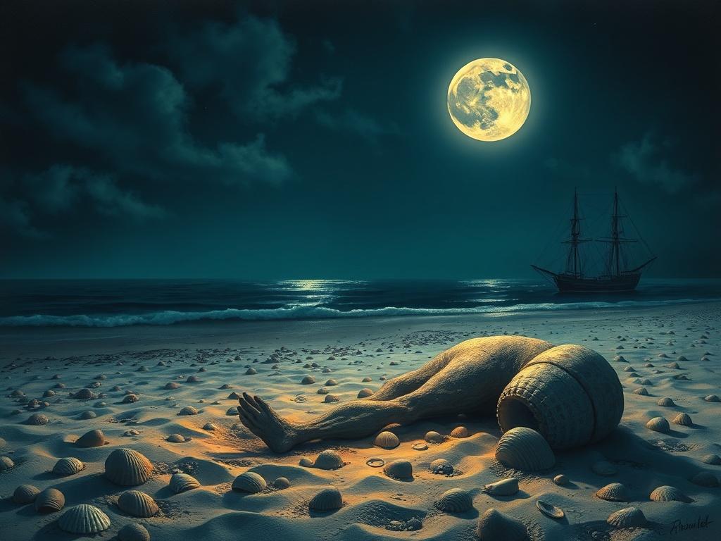 Sotto la luna il mare custodisce la chiave, e la sabbia nasconde il sogno d'una vecchia nave. Lo sguardo scava segni oltre il chiarore, e trova, tra le conchiglie, un segreto d'amore.