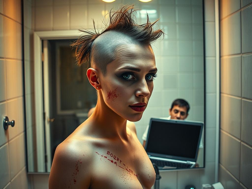 Jump-Scare-Momente: der erste Blick in den Spiegel, das kurze Aufatmen ("okay...") und dann die Erkenntnis in HD. Soundtrack: Zoom-Benachrichtigung + Nachbarshund = maximale Dramatik.
