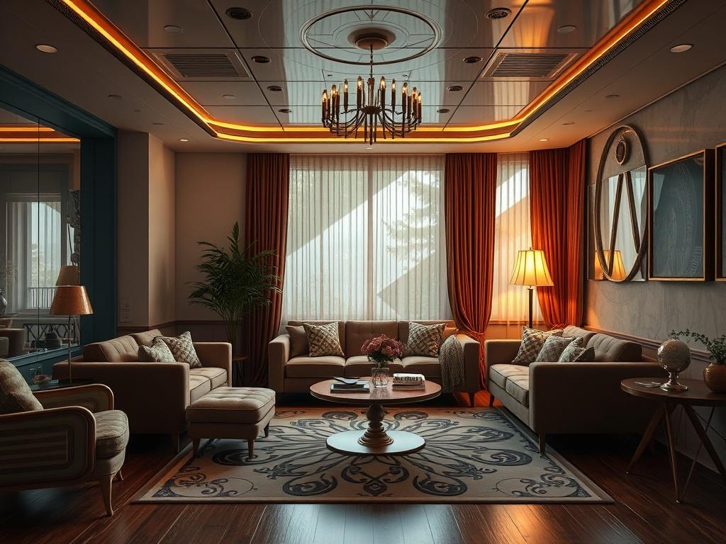 Typowy salon w „rozkwicie” 2050+ łączy tradycyjny fason kanapy (głębokie siedzisko, zaokrąglone podłokietniki, pikowania) z cyfrowymi dodatkami: holograficzne panele z wymiennymi motywami kwiatowymi, modułowe stoliki reagujące na nastrój, a nawet mikrowarstwy tkanin z biodegradowalnymi barwnikami, które zmieniają nasycenie koloru w zależności od pory dnia. Mówiąc krótko — estetyka retro spotyka się z produkcją zero-waste i AI‑asystentem doboru tkanin.