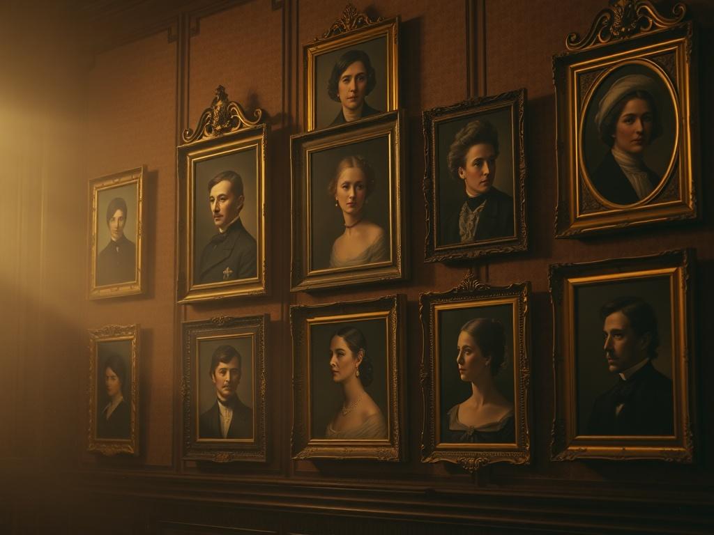 In gilded frames the quiet faces gleam,