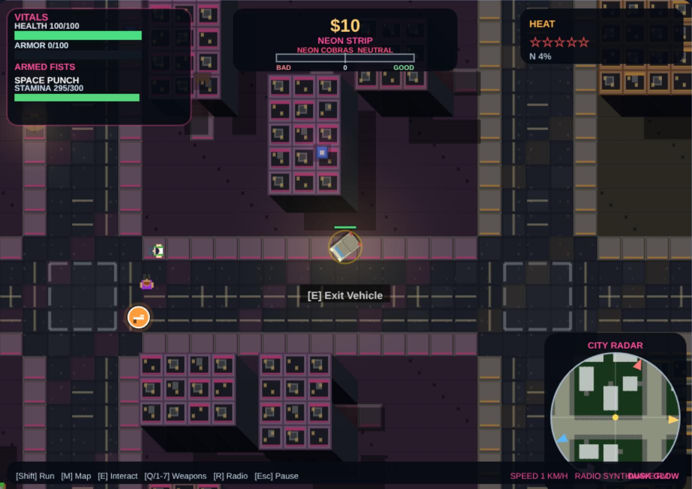 Vibe City is a top-down open-world action driving game with a neon steampunk street-crime feel inspired by classic GTA2-style gameplay. It blends driving, carjacking, police chases, gang turf, payphone missions, weapon combat, and arcade city exploration in a dark, moody, readable city filled with distinct districts, gang identity, lights, traffic, pedestrians, and clear mission guidance.
