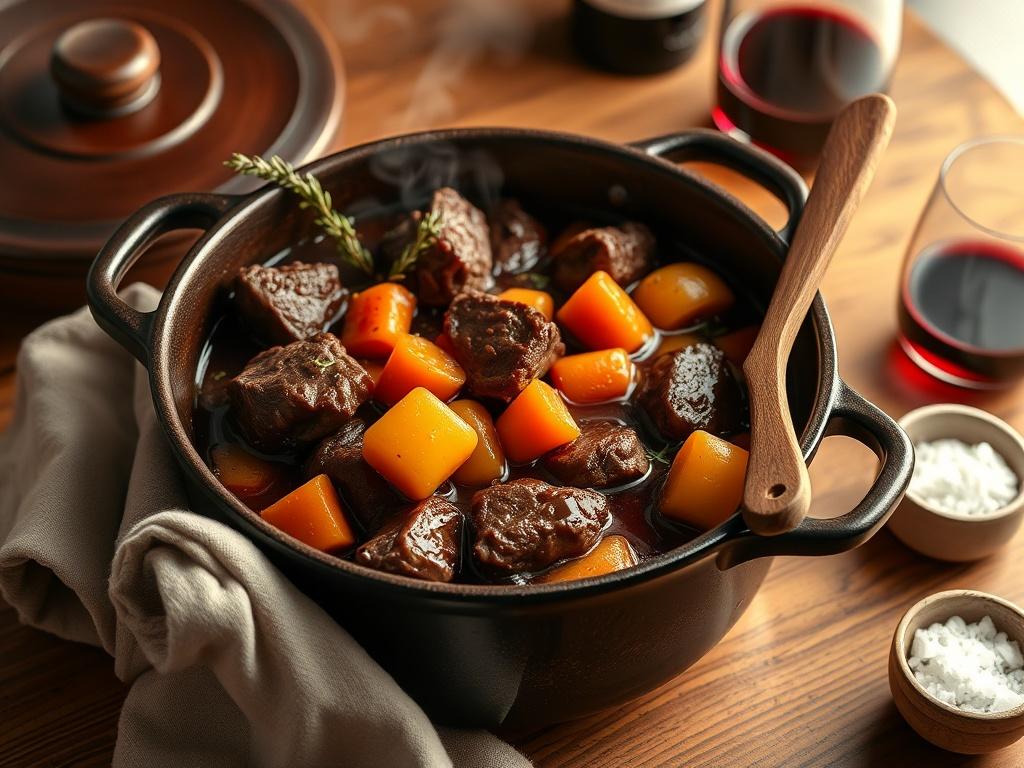 A rich, comforting beef stew braised slowly in red wine and beef stock until meltingly tender. Deep flavors develop from browning the meat, sautéed aromatics, and a long, gentle simmer. Serve with crusty bread, mashed potatoes, or buttered noodles for a hearty meal.