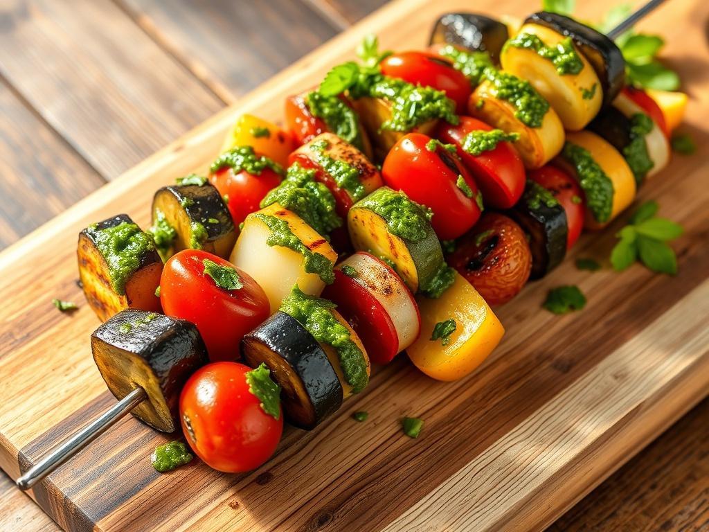 Des brochettes colorées de légumes grillés, servies avec une sauce chimichurri fraîche et acidulée — un plat simple, sain et plein de saveurs, parfait pour les barbecues, les repas d'été ou comme accompagnement végétarien.