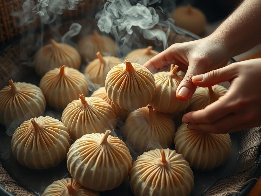 Buuz são pequenos bolinhos cozidos no vapor originários da Mongólia, tradicionalmente recheados com carne de cordeiro ou carneiro e consumidos em celebrações como o Tsagaan Sar (Ano Novo Lunar). São macios, suculentos e ligeiramente temperados, com um formato fechado no topo que pode deixar uma pequena abertura para o vapor. Esta receita ensina a massa, o recheio e a técnica de dobragem clássica.