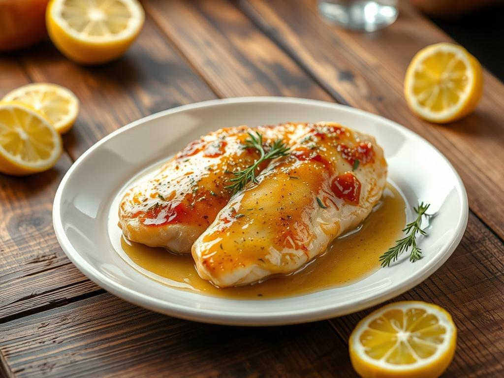 Servieren Sie Chicken Piccata mit frisch gekochter Pasta (z. B. Spaghetti oder Linguine), gedämpftem Reis oder ofengeröstetem Gemüse. Zitronscheiben als Garnitur betonen die Frische des Gerichts.