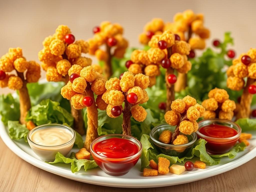 Für eine "Wald"-Atmosphäre kannst du mehrere Bäume auf einem großen Teller anordnen. Experimentiere mit verschiedenen Größen von Dino-Nuggets, um unterschiedliche Baumdimensionen zu schaffen. Knabbertips: Wenn du keine Zahnstocher verwenden möchtest, kannst du die Nuggets auch einfach so auf einem Teller arrangieren und zum Dippen anbieten.
