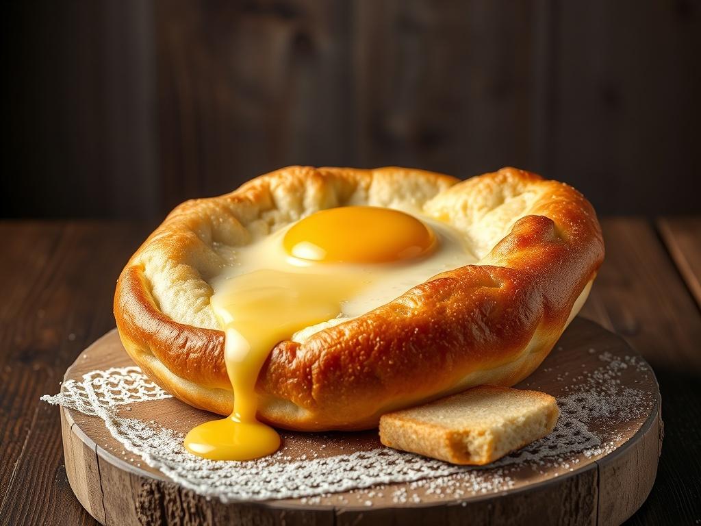 El khachapuri es un pan relleno de queso típico de Georgia, crujiente por fuera y con un interior cremoso de quesos fundidos. La variedad adjaruli (adjariano) tiene forma de barca y se sirve con un huevo y mantequilla en el centro, que se mezclan con el queso caliente al momento de comer.