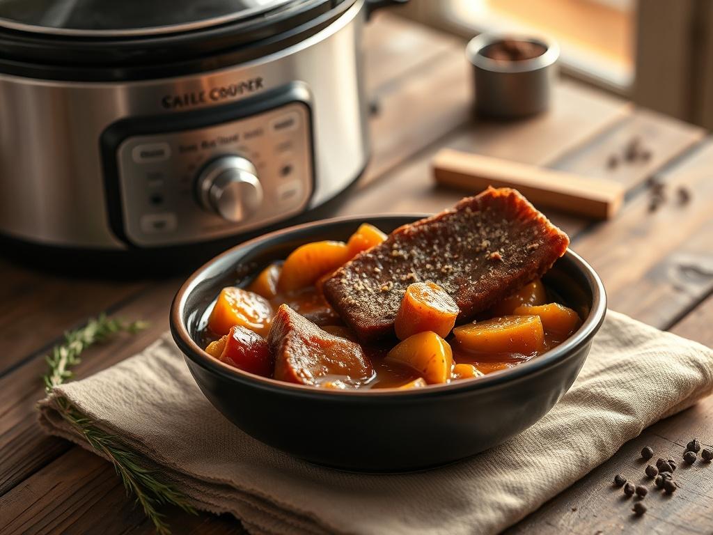 6. Cottura lenta: impostare la slow cooker su basso e cuocere per 6–8 ore, oppure su alto per 3–4 ore, fino a quando la carne è morbida e si sfalda facilmente. Se si usa il forno, coprire la casseruola e cuocere a 150°C per circa 3–4 ore controllando la tenerezza.
