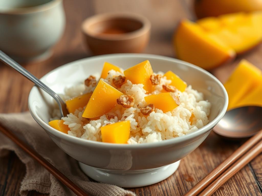 7. Serwowanie: Na talerzu ułóż porcję gorącego ryżu, obok ułóż plasterki mango i polej wierzch odrobiną gęstego sosu kokosowego. Posyp prażonym sezamem lub ziarnami fasoli mung, jeśli używasz.