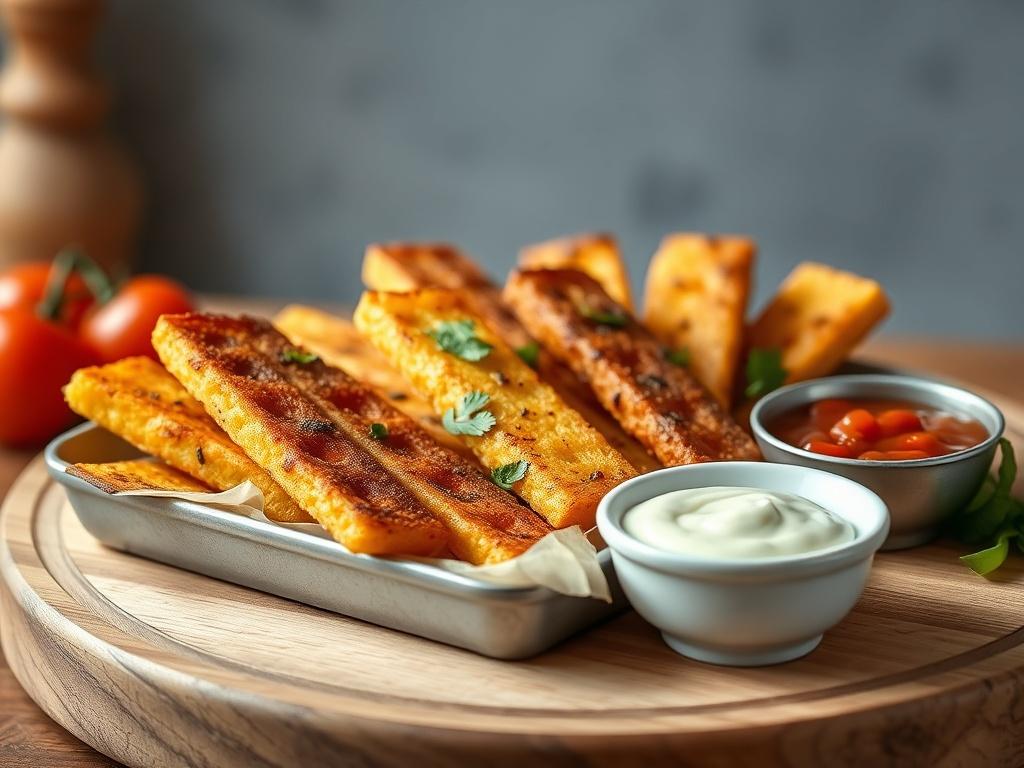 Palitos de polenta crujientes por fuera y cremosos por dentro, una alternativa vegetariana y sin gluten a las papas fritas. Ideales como aperitivo, acompañamiento o snack, se pueden hornear o freír según la preferencia.