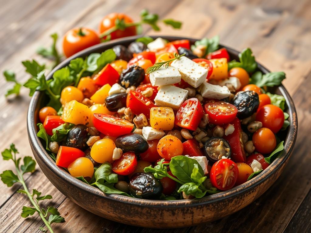 Uma salada colorida e nutritiva que combina legumes assados caramelizados com folhas frescas, ervas e um molho simples. Ideal como prato principal leve ou acompanhamento, servida morna ou em temperatura ambiente.