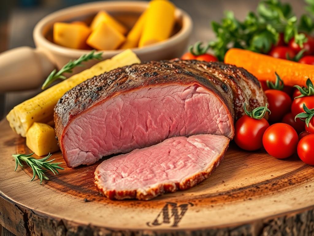 Das Schweinefilet in Scheiben schneiden (gegen die Faser) und zusammen mit dem gerösteten Gemüse anrichten. Optional mit frischen Kräutern (Petersilie, Thymian oder Rosmarin) bestreuen.