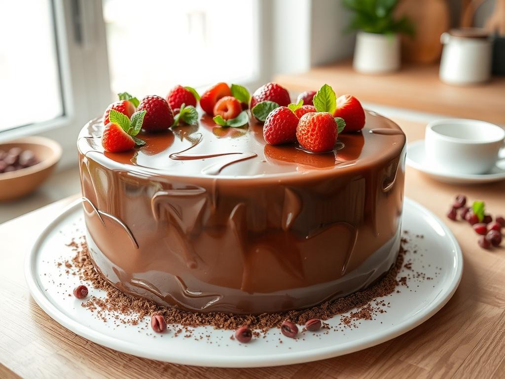 Per la glassatura, prepara una ganache sciogliendo 150 g di cioccolato vegano con 100 ml di panna di cocco o latte vegetale. Decorare la torta con frutta di stagione, noci o granella di nocciole.