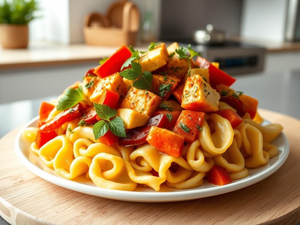 - Nudeln nach Packungsanweisung kochen, abgießen und mit kaltem Wasser abschrecken.